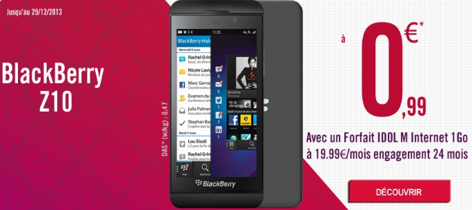 Le Blackberry Z10 est à partir de 49.99€ soit 0.99€ en indiquant le code promo « Z10 » avec un forfait iDOL M à partir de 13.99€ ou encore avec un forfait bloqué à partir de 15.99€. La remise est également valable avec les forfaits iDOL S sans engagement avec option mobile à 4€ par mois pendant 24 mois soit à partir de 7.99€ (forfait iDOL S 2h à 3.99€ +option mobile à 4€). Le mobile est à 199.99€ soit 150.99€ à la commande puis 4€ par mois pendant 24 mois.
