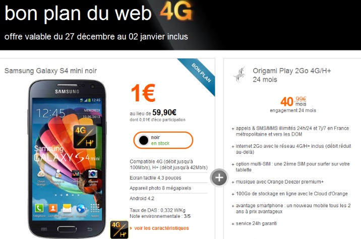 Le Samsung Galaxy S4 Mini est au prix de 1€ au lieu de 59.90€, cette offre est valable pour toute nouvelle souscription à un forfait 4G 2Go chez Orange avec un engagement 24 mois entre le 27 décembre et le 02 janvier 2014.