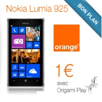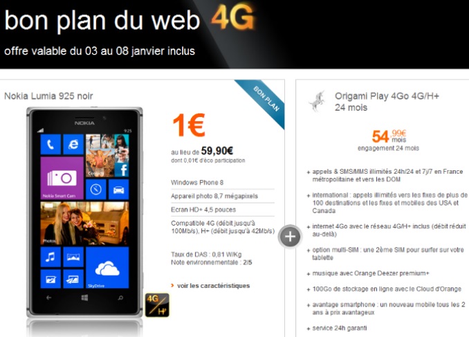 Le Nokia Lumia 925 est au prix de 1€ au lieu de 59.90€, cette offre est valable pour toute nouvelle souscription à un forfait 4G 4Go chez Orange avec un engagement 24 mois entre le 03 et le 08 janvier 2014.