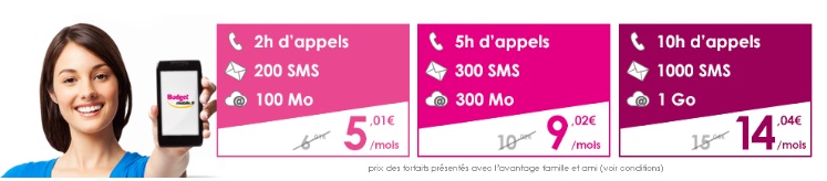 - Le forfait 2H passe de 5.99€à 6.01€ avec 2h d’appels, 200SMS et un accès Internet de 100Mo.