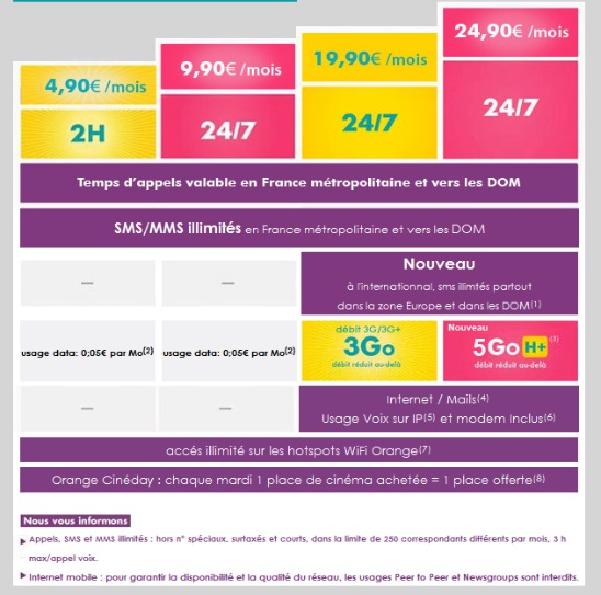 - Multi-Sim à 5€ par mois avec des frais de mise en service de 10€, non compatible avec les forfaits à 4.90€ et 9.90€