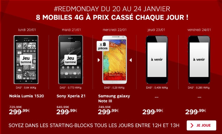 - #REDMonday consiste à proposer chaque jour entre le 20 et 24 janvier, un Smartphone 4G à un prix exceptionnel de 299.99€. Cette opération s’adresse aux abonnés RED de SFR n'ayant pas fait de renouvellement de mobile sans engagement depuis les trois derniers mois.