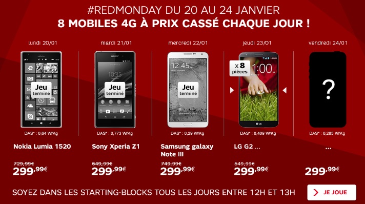 -Chaque jour depuis le 20 janvier, RED propose un Smartpone 4G au prix de 299.99€, et reservé uniquement aux abonnés RED de SFR n'ayant pas fait de renouvellement de mobile sans engagement depuis les trois derniers mois.