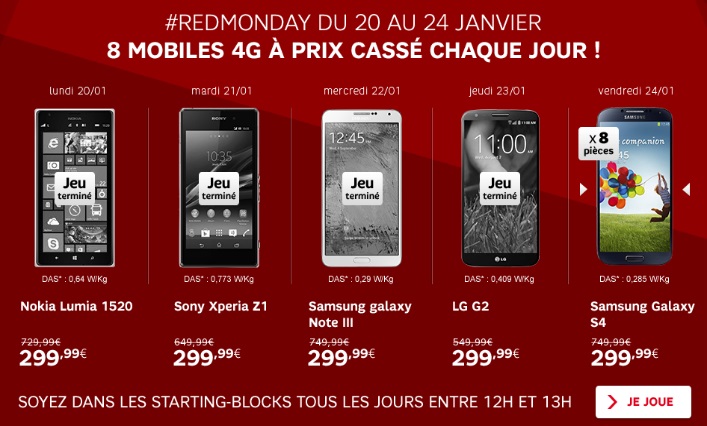 Le Samsung Galaxy S4 au prix incroyable de 299.99€ le 24 janvier 2014 pour les 8 premiers inscrits entre 12h et 13h, vous êtes clients RED alors tentez votre chance en vous inscrivant sur le site SFR.FR .