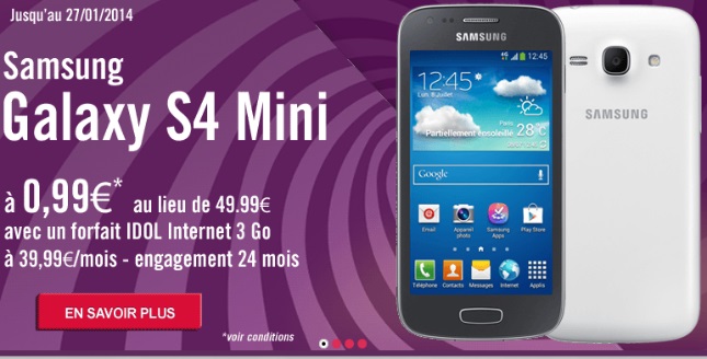 Le Samsung Galaxy S4 Mini est au prix de 0.99€ au lieu de 49.99€ avec la souscription simultanée au forfait iDOL XL à 39.99€ avec un engagement de 24 mois. C’est simple pour bénéficier de la remise immédiate de 49€, vous devez indiquer le code promo « S4MINI » lors de l'inscription.