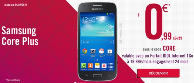 Virgin Mobile vous offre une réduction immédiate de 49€ pour l’achat du Samsung Core Plus entre le 29 janvier et 04 février 2014. Pour profiter de la remise, vous devez indiquer le code promo « CORE » lors de la commande. Le mobile vous revient à 0.99€ au lieu de 49.99€ avec un forfait avec un engagement de 24mois.