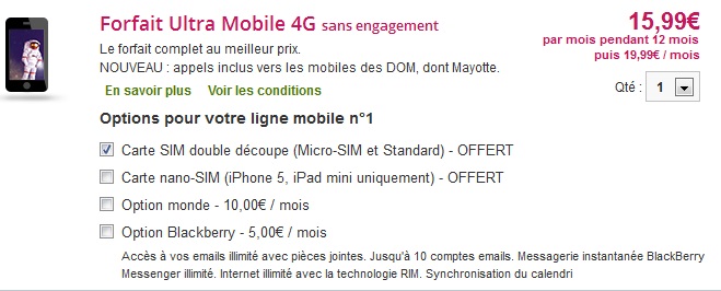 Numericable propose une option à 10€ pour profiter d’appels illimités vers des destinations internationales* supplémentaires soit un forfait illimité Monde à 29.99€ avec les appels illimités vers les fixes de 100 destinations internationales. Le forfait 4G est également disponible en pack avec une offre Internet à partir de 47.89€ sans les promotions en cours.