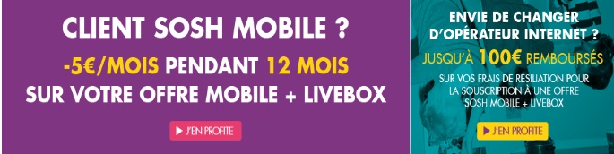 Pour les clients Sosh mobile, l’opérateur vous offre une remise de 5€ par mois pendant 12 mois sur votre forfait mobile + livebox.
