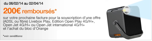 -Pour l’achat du bloc Orange « le vidéoprojecteur » avec la souscription à une offre Livebox Play ADSL ou Fibre ou Open Play 4G ou Open Jet, l’opérateur vous rembourse 200€. Le bloc est au prix de 399.99€ soit 199.99 avec l’offre de remboursement différé.