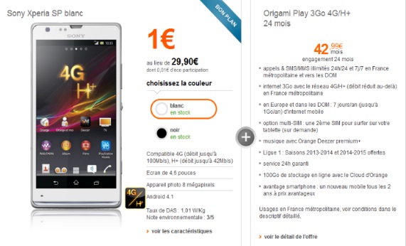 Le Sony Xperia SP est au prix de 1€ au lieu de 29.90€ grâce à la remise immédiate jusqu’au 13 février prochain. Pour bénéficier de la réduction pour l’achat de ce Smartphone vous devez souscrire à un forfait Origami Play 3Go 4G/H+ à 42.99€ avec un engagement de 24 mois chez Orange.