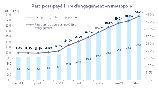 Le parc des forfaits sans engagement a nettement progressé depuis l’arrivée de Free Mobile en Janvier 2012 et les abonnés à des offres libres de tout engagement continuent d’augmenter depuis. On passe de 11.8 millions à 26.2 millions depuis l’entrée du quatrième opérateur sur le marché et sur le dernier trimestre 2013 par rapport au trimestre précédent, on note une croissance de 2.4millions. La multiplication des forfaits sans engagement à très bas prix séduisent de plus en plus les Français, la part des offres sans engagement est de 43.9%.