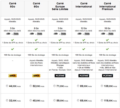 L'opérateur SFR procède à un relooking de son catalogues de forfaits propose à partir d'aujourd'hui une offre en édition limitée nommée 'Carrée Europe'et qui correspond à des appels illimités, des SMS et MMS ainsi que d'un accès Internet depuis votre mobile vers et depuis l'Europe les DOM dans une limite de 3Go (en 4G pour les connexions en France). Egalement, SFR vous propose de choisir un 'EXTRA' parmi les options iCoyote, Napster, Canalplay, Gameloft ou encore SFR Presse. Et enfin vous profiterez de l’option MultiSurf sans frais et du cloud avec 100Go de stockage.