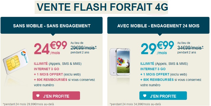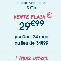 Le forfait Sensation 4G 3Go de Bouygues Telecom est au prix de 29.99€ sans engagement soit 24.99€ pendant 24 mois grâce à la vente flash. Cette offre est disponible avec un engagement de 24 mois et achat de mobile au prix de 34.99€ soit 29.99€ pendant 24 mois avec la remise de 5€ pendant 24mois. Pour profiter de la réduction de 5€ par mois sur le prix du forfait pendant 24 mois, vous devez souscrire entre le 13 et 17 février prochain.