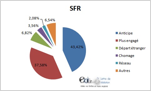 Le 1er motif est la résiliation anticipée avec 43.42% des résiliations concernées. Grâce à la loi châtel, vous pouvez désormais résilier votre ligne mobile par anticipation au bout du 13ieme mois d’engagement pour tout engagement ou réengagement de 24 mois, en payant 25% des sommes restantes au lieu de la totalité.
