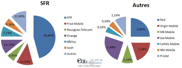 Pour 45.84% des clients, ils retournent chez leur opérateur, en l’occurrence SFR. En effet, la fidélité aujourd’hui n’est pas assez récompensée, c’est donc plus intéressant de souscrire une ligne en tant que nouveau client et surtout d’acquérir un nouveau mobile à moindre coût, 2.98% se tournent vers Red de SFR. Ils sont donc 48.82% à rester fidèles à SFR. Free Mobile récupère 12.50% des clients SFR, grâce à ses forfaits mobiles à prix cassés à partir de 2€ et 0€ pour les abonnés Freebox, le quatrième opérateur séduit beaucoup de clients. 10.71% des abonnés SFR se tournent vers l’opérateur Orange et 5.95% se tournent vers Bouygues Telecom. En novembre 2013, les abonnés SFR ont été plus nombreux à revenir chez leur opérateur, rappelons que les opérateurs historiques ont mis le paquet sur les forfaits 4G entre septembre et décembre 2013 ce qui a permis à SFR de garder plus de clients.