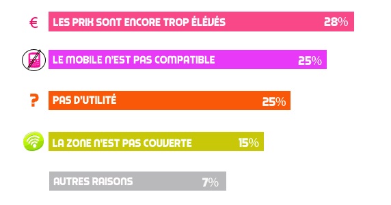 35% des sondés ne sont pas prêts à opter pour un forfait 4G, en effet les Français qui ont profité de l’arrivée de Free Mobile pour baisser leur facture mobile n’ont pas du tout l’intention de passer à un forfait 4G et payer plus cher. 28% des internautes considèrent que les prix restent encore élevés, 25% n’ont pas l’intention de s’équiper d’un mobile 4G et 25% n’ont pas l’utilité. Parmi ceux qui n’envisagent pas de souscrire à un forfait 4G, 15% ne sont pas encore couverts.