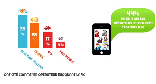 Grâce aux publicités des opérateurs historiques sur la 4G ces derniers mois, les Français sont nombreux à pouvoir associer la 4G à un opérateur. Bouygues Telecom qui a mis le paquet en octobre dernier avec une couverture record de 63% de la population Française est en tête du classement. En effet, on note sur l’étude réalisée sur la 4G par Edcom que 84% des internautes ont cité un opérateur dont 35% pour Bouygues Telecom, 28% pour Orange, 17% pour SFR et 9% pour Free Mobile. La 4G relayée en masse sur tous les supports de communication « pub TV, presse, web, radio… », agace un certain nombre, 44% des sondés pensent que les opérateurs en font trop.