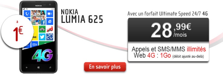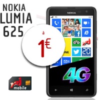 NRJ Mobile propose le Nokia Lumia 625 compatible 4G à 1€ avec un forfait 4G 1Go à 28.99€ par mois avec un engagement de 24 mois.