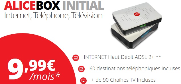 L’offre Alice Box Initial proposait jusque là la TV en option à 1.99€ en plus de l’offre à 9.99€ + 10€ pour l'abonnement téléphonique et désormais les trois services Internet, TV et téléphone illimité sont intégrés pour 19.98€ en dégroupage totale soit 0.01cts de moins que Bouygues Telecom. L’abonnement comprend un accès Internet Haut débit, les appels illimités vers les fixes en France et vers les fixes de 60 destinations internationales et la TV avec plus de 90 chaines incluses, le service TV replay et décodeur enregistreur numérique de 40Go.