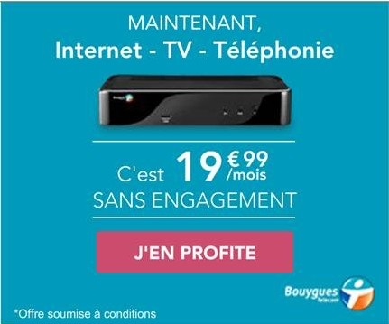 L’offre Bbox de Bouygues Telecom est au prix de 19.99€ et intègre un accès Internet haut débit avec un espace de stockage en ligne de 20Go, la télévision jusqu’à 165 chaines, un enregistreur numérique de 40Go et un accès au catalogue de VOD ainsi qu’à la télévision de rattrapage. Vous profitez également du téléphone illimité vers fixes en France métropolitaine et vers les fixes de 121 destinations internationales.