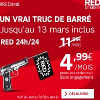 -Le forfait Red 24/24 à 11.99€ est en promo au prix de 4.99€. Cet abonnement comprend les appels illimités vers les fixes et mobiles en France Métropolitaine, vers l’Amérique du nord, les DOM (hors Mayotte) et les fixes de 41 destinations ainsi que les SMS et MMS illimités, un accès Internet de 50Mo non bloqué (rechargé automatiquement 50Mo à 2€ dans la limite de 4 rechargements) et SFR Wifi illimité.