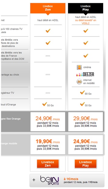 La Livebox Play est au prix de 29.90€ par mois au lieu de 39.90€ et comprend les mêmes avantages que la Livebox Zen, cependant le débit est plus rapide jusqu’à 50Méga avec le VDSL 2 à condition d’être éligible. Les appels sont illimités vers les mobiles en France, un décodeur enregistreur TV de 80Go et un avantage au choix cinéma, Deezer, ou internet en mobilité est proposé en plus.