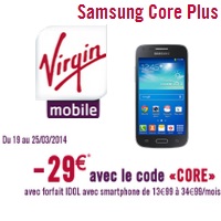 Le Samsung Core Plus est au prix de 29.99€ soit 0.99€ avec la remise immédiate de 29€ avec un forfait avec engagement de 24 mois chez Virgin Mobile, à partir de 13.99€ avec les offres IDOL M et à partir de 15.99€ avec les abonnements bloqués. La remise s’applique également avec les forfaits iDOL S sans engagement à partir de 3.99€ avec option mobile à 4€ par mois. Le Smartphone est au prix de 1€ au lieu de 29.99€ à la commande puis 4€ par mois pendant 24 mois. Pour profiter de la remise, vous devez indiquer le code promo « CORE » lors de l’inscription.
