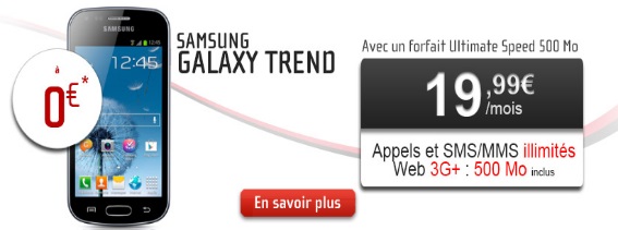 Pour profiter du Samsung Galaxy Trend à 0€ devez souscrire au forfait Ultimate Speed 500Mo à 19.99€ avec un engagement de 24 mois. Le mobile est facturé 30€ à la commande et le constructeur Samsung vous rembourse jusqu'à 30€ jusqu'au 30 Avril prochain en complétant et renvoyant le coupon avec la liste des pièces demandées. Dans le cadre d'une portabilité de numéro, l'opérateur vous offre jusqu'à 50€ sur vos frais de résiliation jusqu'au 13 mai prochain.