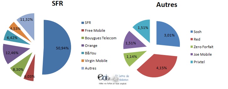 6.42% se tournent vers l'opérateur Low Cost B&You qui propose des offres à partir de 2.99€ et 4.53% vers Virgin Mobile qui propose des forfaits mobiles sans engagement à partir de 3.99€. 3.01% se tournent vers Sosh opérateur Low Cost d'Orange, 1.51% des abonnés se tournent vers Joe Mobile et Prixtel qui et 1.14% vers Zero Forfait.