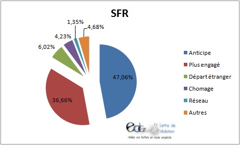 Le 1er motif est la résiliation anticipée avec 47.06% des résiliations concernées. Grâce à la loi châtel, vous pouvez désormais résilier votre ligne mobile par anticipation au bout du 13ieme mois d’engagement pour tout engagement ou réengagement de 24 mois, en payant 25% des sommes restantes au lieu de la totalité.