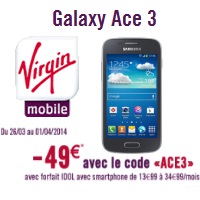 Grâce à la vente flash proposée par Virgin Mobile pour l'achat du Samsung Galaxy Ace 3 entre le 26 Mars et 01 Avril prochain, le mobile vous revient à 0.99€ au lieu de 49.99€ avec la souscription simultanée à un forfait iDOL M avec un engagement de 24 mois. La remise immédiate de 49€ est compatible avec les forfaits iDOL M à partir de 13.99€, les forfaits bloqués à partir de 15.99€ ou encore les forfaits iDOL S Sans engagement à partir de 3.99€avec l'option mobile à 4€ par mois. Dans le cas ou vous choisissez un forfait sans engagement avec option mobile, le Smartphone est au prix de 129.99€ soit 80.99€ avec la remise.