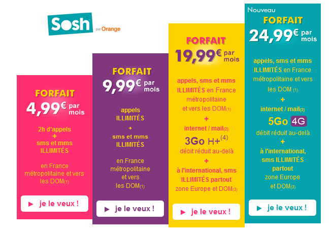 Rappelons que les iPhones 5C et 5S sont compatibles 4G chez Sosh et si vous souhaitez profiter de la 4G, vous devez souscire à un forfait 4G proposé à 24.99€ chez Sosh et vérifier la couverture réseau.