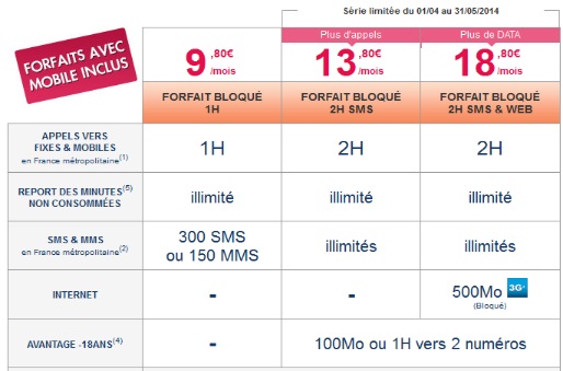 Le forfait bloqué 1h + SMS illimités évolue et passe à 2H d’appels par mois. Cette offre reste au même prix soit à 13.80€ avec engagement de 24 mois et 16.80€ avec engagement de 12 mois. L'abonnement comprend 2h de communication par ainsi que les SMS et MMS illimités et le report des minutes en illimité.