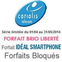 Coriolis fait évolué le forfait Ideal Smartphone 2H pour 1€ de plus par mois. En effet, le volume data passe de 200Mo à 500Mo. Cette offre intègre 2h de communication par mois ainsi que les SMS et MMS illimités et un accès Internet de 500Mo au-delà 2€/100Mo. Les forfaits Eco iDeal, iDeal Smartphone (offre sans mobile) avec engagement de 12 ou 24 mois disparaissent du catalogue.