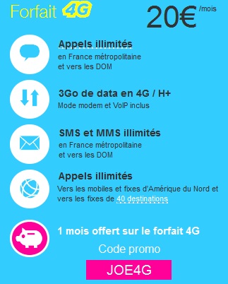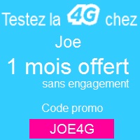 Joe Mobile vous offre un mois de forfait 4G jusqu’au 18 Avril prochain, vous pouvez ainsi tester gratuitement la 4G chez l’opérateur. C’est simple, pour profiter de la promotion, il vous suffit de souscrire au forfait 4G à 20€ par mois sans option et indiquer le code promo « JOE4G » lors de la commande. La remise s’applique également aux abonnés actuels qui migrent vers un forfait 4G jusqu'au 18/04/2014, dans la limite d'une ligne par membre.