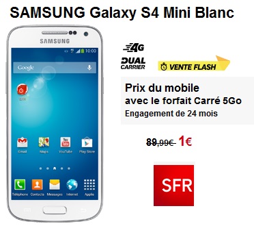 Le Samsung Galaxy S4 Mini est disponible en Blanc, Noir, et Black Edition au prix de 1€ au lieu de 89.99€ avec la souscription à un forfait Carré 4G 5Go à 44.99€ avec un engagement de 24 mois chez SFR. La remise est immédiate lors de l'inscription jusqu'au 22 Avril minuit.