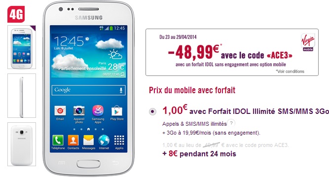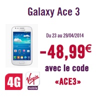 Le Samsung Galaxy Ace 3 est au prix de 1€ au lieu de 49.99€, grâce à la vente flash proposée par Virgin Mobile entre le 23 et 29 Avril prochain avec la souscription simultanée à un forfaits iDOL S sans engagement à partir de 3.99€ avec l'option mobile à 8€ par mois pendant 24 mois. En souscrivant à un forfait iDOL M à partir de 13.99€ ou un forfait bloquéà partir de 15.99€ avec un engagement de 24 mois, le mobile vous revient à 31€ au lieu de 79.99€.