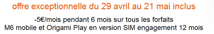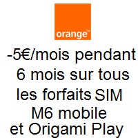 Tous les forfaits mobiles en version SIM (offre sans mobile) chez Orange profitent de cette réduction de 5€ par mois pendant 6 mois (hors Origami Zen et Jet). La remise est automatique et valable entre le 29 Avril et le 21 Mai prochain pour toute souscription via internet. Vous profitez ainsi d’un forfait bloqué à partir de 4.99€ et d’un forfait 4G avec 3Go data à 27.99€.