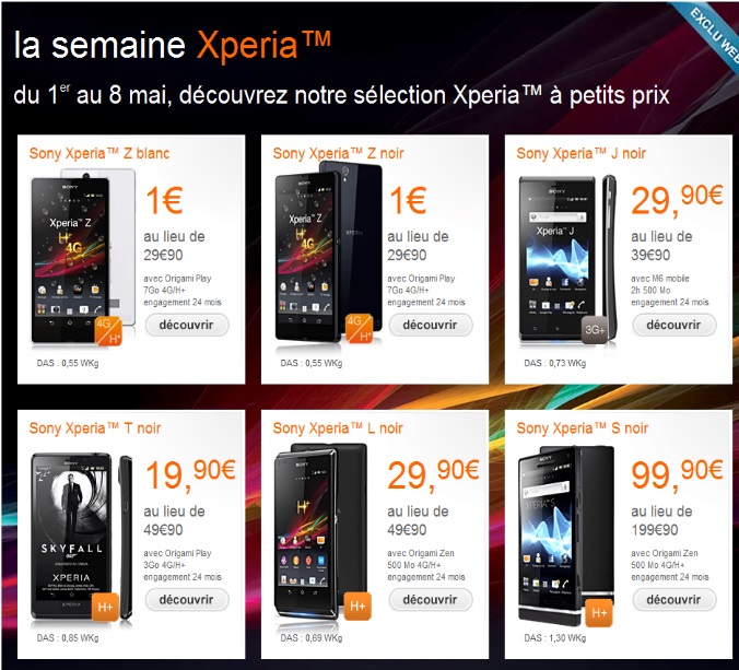 -Le Sony Xperia L à 29.90€ au lieu de 49.90€, et le Sony Xperia S à 99.90€ au lieu de 199.90€ avec un forfait Origami Zen 500Mo à 29.99€.