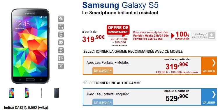 -449.90€ avec le forfait 4G 3Go à 34.90€, La Poste Mobile vous offre une remise différée de 50€ soit le S5 à 399.90€,