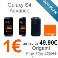 Le Samsung Galaxy S4 Advance est au prix de 1€ au lieu de 49.90€ grâce à la remise immédiate de 48.90 € proposée par Orange entre le 09 et 15Mai prochain. Pour profiter de la vente flash pour l'achat de ce Smartphone, vous devez souscrire à un forfait Origami Play 7Go 4G/H+ à 52.99€ avec un engagement de 24 mois chez Orange.