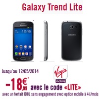 La vente flash pour l’achat du Samsung Galaxy Trend Lite chez Virgin Mobile est valable entre le 09 et 12 mai prochain, vous profitez ainsi d’une remise immédiate de 18.99€ lors de l’inscription. Pour profiter de ce modèle à 1€ à la commande, vous devez souscrire simultanément à un forfait iDOL S avec l'option mobile à 4€ par mois pendant 24 mois. Le mobile est sinon disponible à 99.99€ au comptant soit 81.01€ avec la remise immédiate de 18.99€ avec un forfait sans engagement. Pour bénéficier de la promotion, vous devez indiquer le code promo 'LITE' lors de l'inscription.