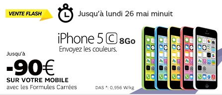 -L'iPhone 5C 8Go est en vente flash au prix de 129.99€ au lieu de 219.99€ avec la souscription simultanée à un forfait Carré 4G 5Go à 44.99€ chez SFR. L’opérateur vous offre 90€ de remise immédiate jusqu’à ce soir lundi 26 Mai minuit.
