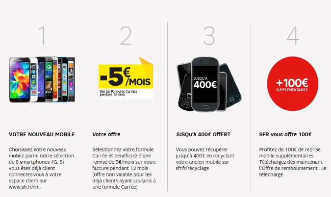 -Le Samsung Galaxy S5 est proposé à partir de 99.99€ grâce à l’offre de remboursement différé de 200€ avec un forfait Carré 24/24 16Go à 149.99€ ou Carré 24/24 12Go ou encore 199.99€ au lieu de 299.99€ avec un forfait Carré 8Go à 52.99€ ou encore 329.99€ avec un forfait Carré 5Go à 44.99€,