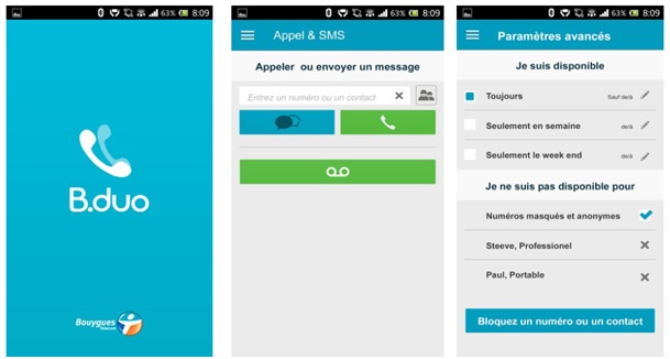 Simple d’utilisation, B.duo propose à chaque client la possibilité, via une application spécifique Android, iOS ou Facebook, de filtrer les appels entrants, paramétrer sa disponibilité (par jour/heures), activer la fonction « ne pas déranger » en renvoyant les appels directement sur une messagerie vocale visuelle dédiée.