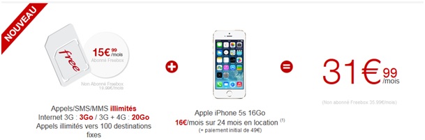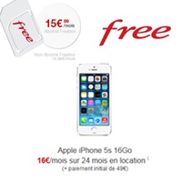 Pour l'iPhone 5S 16Go Free Mobile vous propose de le payer 49€ à la commande, puis de le louer pour 16€ par mois sur un engagement de 24 mois. Ce qui vous fera une facture mensuelle de 31.99€ (forfait illimité + mobile) si vous êtes abonnés Freebox, ou 35.99€ par mois si vous n'êtes pas client ADSL Free.