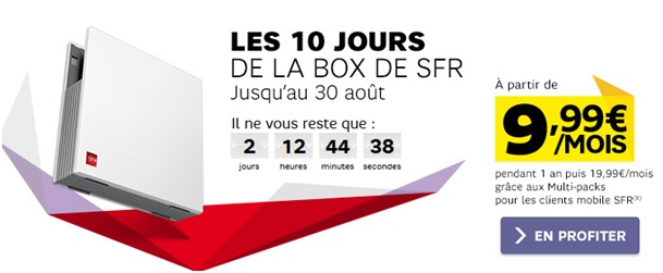 La remise Multipacks étant compatible avec cette promo de rentrée, si vous êtes abonnés à un forfait mobile SFR de la gamme SFR Gold soit avec un minimum de 3Go de Data, vous profitez de 10€ de remise supplémentaire. Pour les plus chanceux donc, la Box de SFR vous en coûtera 9.99€ par moi spendant 1 an !