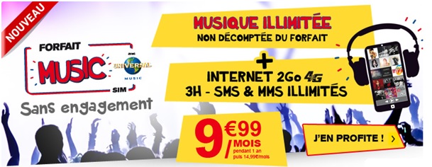 Le forfait Music SIM 3H sans engagement est au prix de 9.99€ pendant 12 mois au lieu de 14.99€ et comprend :