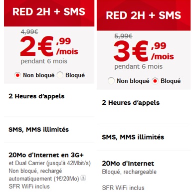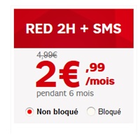 2€ de remise pendant 6 mois sur les forfaits RED sans engagement de 2H en version bloquée ou non : Cette offre est réservée aux 20 000 premiers clients. En cas de changement de formule au cours des 6 mois, le client RED perd sa remise. Au terme des 6 mois de remise, le client sera facturé au tarif mensuel en vigueur. Cette remise est incompatible avec toute autre offre promotionnelle en cours (hors parrainage RED). La carte SIM est facturée 5€ à la commande.