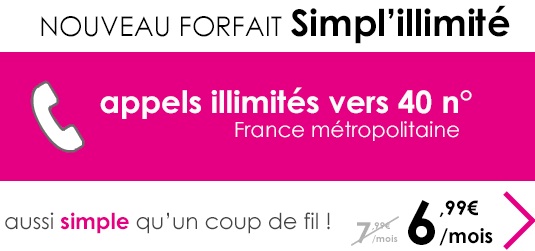 Le nouveau forfait appelé Simpl'illimité est au prix de 7.99€ par mois et sans engagement. Cette offre intègre les appels illimités vers 40 numéros en France, une restriction est appliquée à 15h max par correspondant par mois et 1h max par appel au-delà les appels sont facturés à 0.36€ par minute ou encore 0.18€/min vers des numéros Budget Mobile.